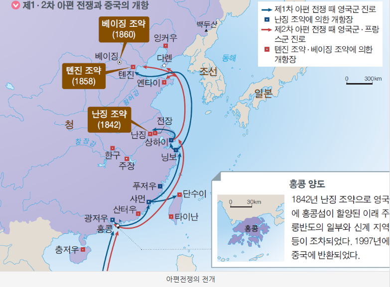 난징조약은 1842년에 일어난다. 청나라와 영국의 아편전쟁에서 패배한 청나라는 많은 배상금을 영국에 지불하고 홍콩 또한 영국에 넘겼고, 상하이 포함하여 5개의 청나라 항구를 개방했다. 5개의 항구는 광저우, 샤먼, 푸저우, 닝보, 상하이이다. 또한 홍콩을 영국에 넘겼기 때문에 영국은 홍콩 지배권을 얻었다. 그리고 전쟁 배상금은 물론 중국에 있는 모든 영국인 석방하고 영국을 도운 중국인은 무죄로 해주고 영국의 관리직들도 중국과 똑같이 대우를 해주었다. 이듬해 추가 조약을 맺어서 영국에 영사 재판권과 최혜국 대우도 인정하게 됐다. 이러한 난징조약은 청나라가 다른 나라와 최초로 맺은 근대적 조약이다. 우리나라 강화도조약처럼 영국에게 일방적으로 아주 유리한 불평등 조약이다. 아편전쟁은 영국과 청나라의 무역불균형으로 인해서 생긴 조약이었고 나중에 청나라가 멸망하는 시발점이 되었다. 하지만 이렇게 불평등 조약으로 인한 무역은 좀처럼 나아지지 않았다. 교육량은 늘지도 않고 항구 내에서만 제한된 무역활동으로는 좋아지지가 않았다. 1856년 애로호 사건을 구실로 제2차 아편전쟁을 일으켰다. 그 사건은 이러하다 광저우 앞바다에 수상한 배 한 척이 떠 있었다. 청나라 관원들은 그 배를 조사했는데 실소유주는 영국인이었고 선원들은 중국인이었다. 청나라 관원은 이를 해적으로 간주했다. 조사 중 영국 국기가 훼손 됐는데 영국은 이때를 기회삼아 영국 국기를 모독했다고 주장하며 제2차 전쟁을 일으켰다. 이때를 기회로 프랑스도 자기 나라 선교사가 청나라에서 피살당한 사건을 구실로 영국과 함께 전쟁에 참여했다. 1858년 영국과 프랑스는 전쟁에 패배한 청나라에게 텐진조약을 맺으려 했다. 그 내용은 즉 더 많은 항구를 추가로 개항하고 크리스트교 선교의 자유를 내용으로 선교사활동을 보장한다는 내용이다. 전쟁에서 패배한 청나라는 여러 강대국의 간섭을 받게 된다. 청나라는 전쟁 배상금으로 인해서 세금을 더 많이 걷게 되었다. 이런 불만으로 청나라 여러 지역에서 민중들이 운동을 벌였으나 모두 실패했고 청나라에서 조약을 깨자고 요구하자 영국과 프랑스 연합군은 베이징을 점령하여 결국 베이징 조약까지 맺었다. 결국 청나라는 텐진조약을 인정하고 영국에 주룽반도를 넘겨주게 되고 베이징조약을 중재한 러시아는 연해주를 얻게 되었다.